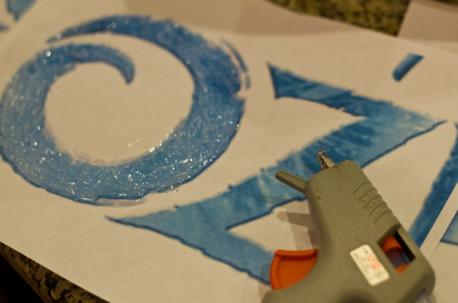 I found a logo on-line and enlarged it and printed it out. Of course, the resolution wasn’t good, but it didn’t matter much when I covered all of the letters in hot glue and then cut them out.