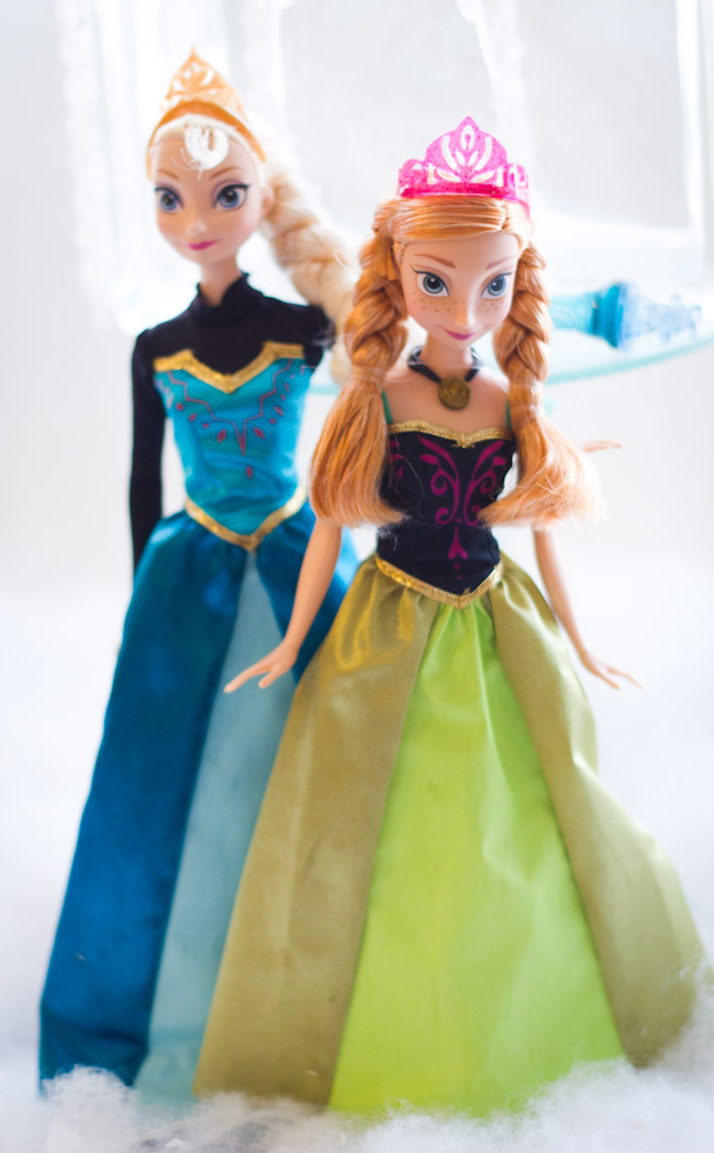 I decided the stars of the show needed to be the stars of my dessert table, so I got these Anna and Elsa dolls in their ball gowns (The skirts reveal patterns when dampened with accompanying applicator). I also got lots of other books and merchandise to give as favors to our guests (more on that in a minute).