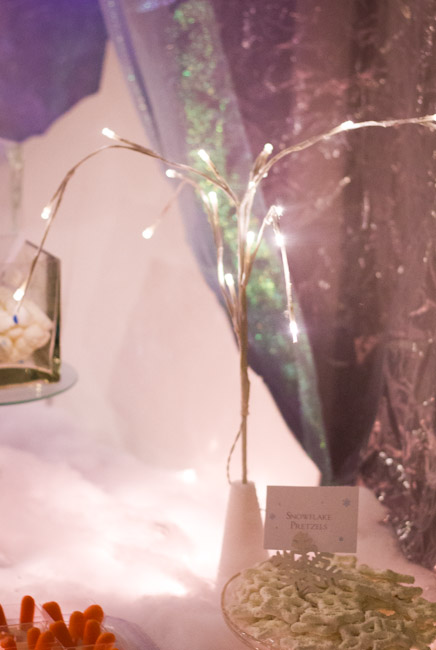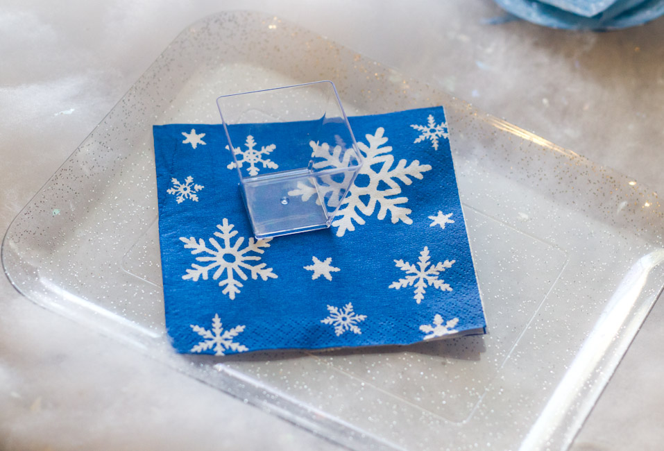 The frosty, sparkly plates, snowflake napkins and cube cups were all from Walmart. I don’t know how I ended up with out a picture, but the cups held “Sven’s Carrots” with dressing in the bottom all served on a tray of ice.