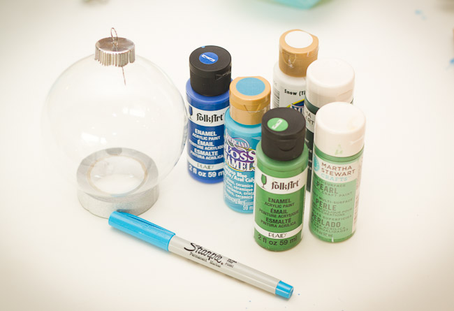 You only need a few basic supplies: Clear ornaments–if the kids are doing these, you make want to make sure you get the plastic kind. Mine are glass, blue or green fine-tipped permanent marker, craft paint in shades of blue green and white–You may want to make sure that you get enamel paint or paint that says it will stay on glass.