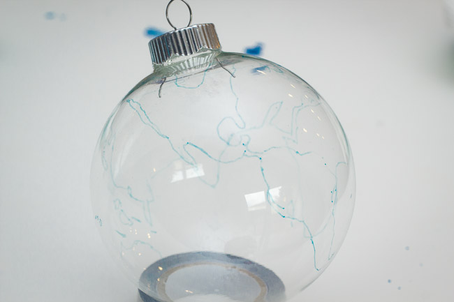 Take the top off of the ornament and pour in paint in a couple of different shades of blue. Depending on the thickness of the paint, you will probably need to water it down a bit first, so that it with swish easily. Then you just swirl and swish and maybe shake the ornament around until all of the clear spaces have turned blue.