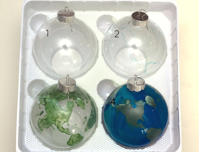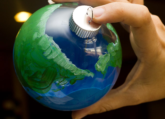 Next I painted the continents green on the outside of the ornament. If you wait until you do the blue paint, it will be too hard to see where to paint. I did Antarctica in white and added to white to northern Russia and Canada. You’ll need to let this dry a bit, or be really careful about where you hold the ornament. This is the fun part and the kids would love to get involved here!