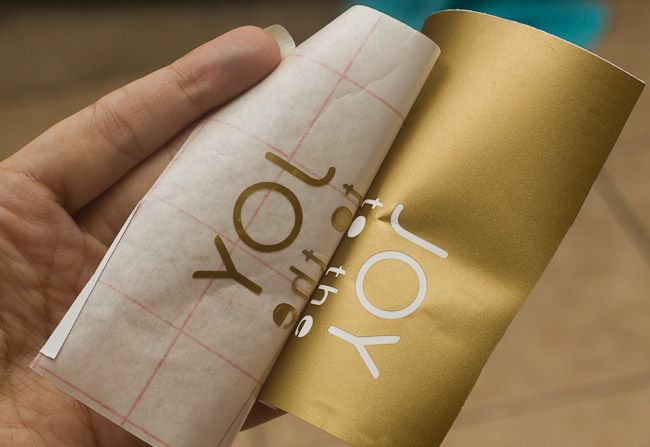 I designed my sayings on my Silhouette software on my computer, and cut them out in gold vinyl.