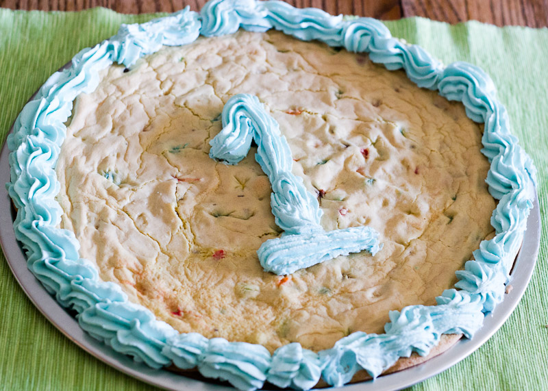 - Mix it all together in a mixer (add the candy or chips last, after the other ingredients have been blended well together) and then divide dough on to the three round sheets. You might need to dampen your fingers to press the dough down into the sheet and smooth it around. Don't push the dough all the way to the edges. Leave a good inch or more of the pan showing all the way around. As the cookie bakes, it will expand and you don't want it spilling over the edge of the pan.
