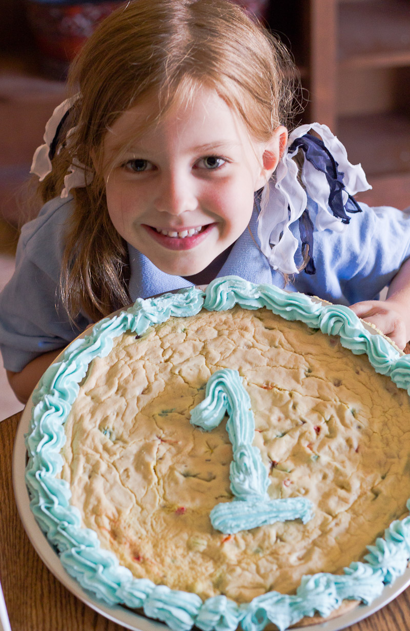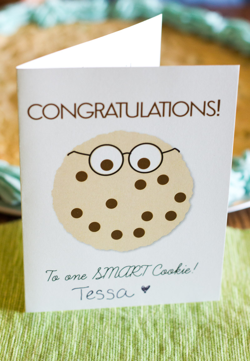 The How Does She? girls first got me thinking about the giant cookie idea, but I wanted to tie it in more directly with going back to school, so I made them “Smart Cookies!” I designed this card–“Congratulations! To One Smart Cookie!”–and printed one for each child. Inside, I wrote them each a note encouraging them to try their hardest this year and reminding them of how much we love them.